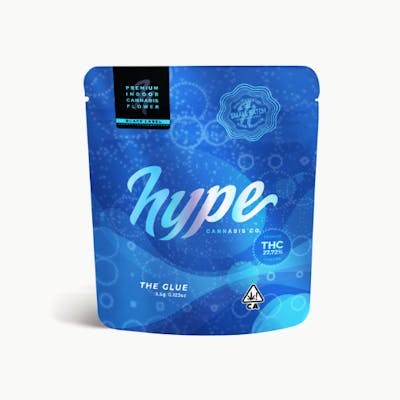 Hype Cannabis Co The Glue is a mellow strong INDICA 3.5g testing 22.66% THC built for fast calm and a late night fade this INDICA flower brings relaxed happy comfort that can lean sleepy find this INDICA at Vibe Cannabis for premium California cannabis.