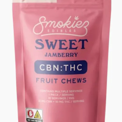 CBN | SLEEP Smokiez Sweet Jamberry CBN:THC 1:1 Fruit Chews are NOT YOUR AVERAGE FRUIT CHEWS™ ;) These delicious fruit chews are a tasty and discreet way for you to medicate! They are also Vegan, Gluten Free, Dairy-Free, and contain NO High Fructose Corn Syrup. Each of our mouth watering fruit chews contain 10 mg of CBN and 10 mg of THC, and made with our high clarity cannabis distillate for great taste. There is 10 pieces per package with 100mg CBN + 100 mg active THC per package. -- SO... WHAT IS CBN? Cannabidol (CBN) is the most sedative-known cannabinoid, making it ideal for a good night's sleep.