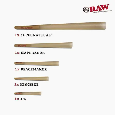 1 x Supernatural = 280mm (88mm Tip) 1 x Emperador = 180mm (45mm Tip) 1 x Peacemaker = 140mm (35mm Tip) 1 x Kingsize = 110mm (26mm Tip) 1 x 1 1/4 = 83mm (26mm Tip) If you feel variety is the spice of life, then look no further, as we've got just enough adaptations of the classic RAW pre-rolled cone that you all know at love! Ranging from the behemoth 12" supernatural all the way down to the lowly and humble 1 1/4 cone, this pack will have every single size to try so you can find out your favourite!