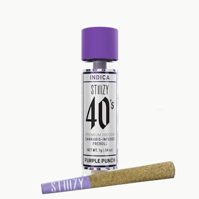 Elevate your pre-roll game. Stiiizy 40s pre-rolls are setting the standard with high potency, cannabis infused joints coated evenly with kief. Using our proprietary live resin infusion methods, we’ve designed every pre-roll to offer 40%+ THC potency with a unique flavor profile. With a smooth inhale and tasteful exhale, each and every Stiiizy 40 is packed with indoor grown flower, specifically made to ensure a potent and long-lasting high. Spark up the 40s.PURPLE PUNCHTASTE: Grape, Berry, SweetFEELING: Relaxed, Happy, EuphoricDESCRIPTION: A cross between Larry OG and Granddaddy Purp. Purple Punch smokes smooth and sweet with a mouthwatering tropical punch flavor.