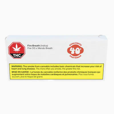 Explore the natural wonders of the Back Forty with Fire Breath slim pre-rolls. A cross between Fire OG and Mendo Breath, Fire Breath is a potent indica-dominant with a profile of dank earth, forest, and diesel. Fire Breath pre-rolls use whole flower and are machine-rolled to perfection, packed in a resealable tray.