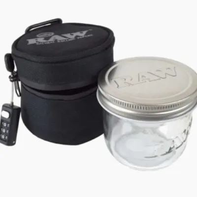 "RAW Mason Jar with Tin Lid and Smell-Proof Carbon Fiber Mesh Cozy and Combo Lock We’ve taken the mason jar to the next level! The RAW Smellproof Cozy & Jar features a 5-layer- smell stopping- drop-resistant- UV-blocking- protective RAWesome case! We also included a child and roommate proof lock.