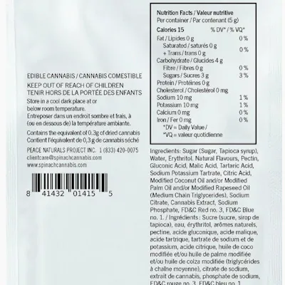 SOURZ by Spinach® Fully Blasted Blue Raspberry Watermelon gummies have 10mg of THC per piece. These dual-flavoured gummies are over-the-top with natural flavours and blasted with sour crystals. Enjoy 10 gummies with 10mg of THC per gummy and 100mg of THC total per pack.
