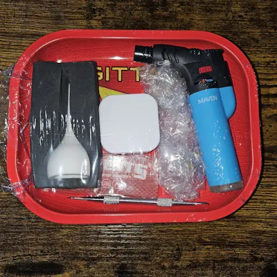 Contains: -Astrology Tray -Dab Tool -Dab Storage Container -Banger -Small Torch Lighter -Ceramic Carb Cap -Raw Magnetic Ashtray -Elements Magnet