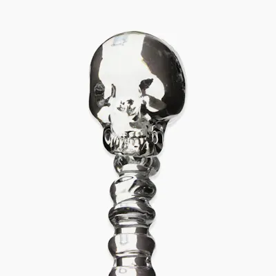 This 5" long glass dabber features a detailed skull head and dabbing scoop at the end of the attached spine. Available in multiple colours.