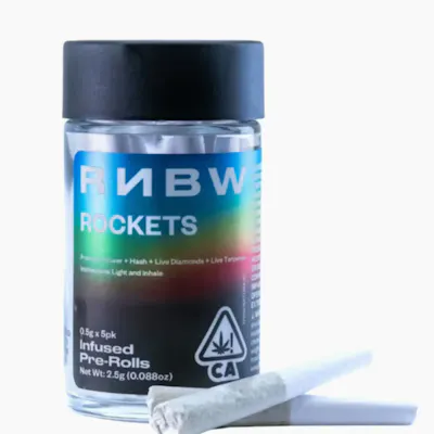 Get ready to blast off with Rnbw's 2.5G Rocket Infused Prerolls 5PK - Grape Nebula [I]. This five-pack of infused rockets is all gas, no brakes, delivering that out-of-this-world vibe you're looking for. It’s got a flavor that’s straight up grape soda, sweet and juicy on the inhale, with a heavy-hitting body high that's perfect for a long-haul sesh with the crew. These are the go-to for when you want to get seriously faded and just chill.RNBW is a premium brand for creators, music lovers, and believers in the power of cannabis. It’s inspired by the way that sound and color moves you. They use the concept of a prism to represent their collective experiences. Each of us, an individual ray of light refracted through that prism displaying a spectrum of colors and memories.