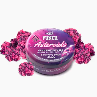 Punch Edibles Asteroids Strawberry Grape Nebula Solventless Hash Gummies 100mg An Industry First- Punch Asteroids. Experience the extraordinary with our pebble-coated gummies, crafted to deliver a unique fusion of flavor and potency. Elevate your edible experience to cosmic heights with our solventless hash-infused asteroids. Strawberry Grape Nebula features a delicious strawberry center surrounded by strawberry and grape candy flavors.