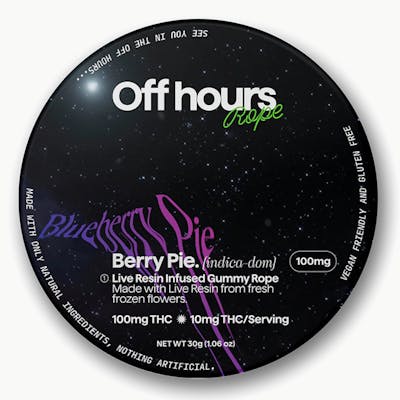 Off Hours Blueberry Pie Live Resin Rope Indica-dominant hybrid (Berry Pie × Cotton Candy), naturally flavored with Blueberry Pie and warm bakery notes. Size & Strength 1 rope (10 segments) 100?mg THC total (10?mg per segment) Effects Provides a cerebral uplift followed by soothing body relaxation—ideal for reading, unwinding, or easing into a mellow mindset. Suggested Use Start with half a segment (approx. 5?mg THC), wait at least one hour before increasing your dose. Ingredients Organic cane sugar, reverse osmosis water, organic tapioca syrup, organic fruit juice concentrate, fruit pectin, organic fruit flavoring, natural food coloring, MCT oil, cannabis extract (live resin), soy extract, terpenes. Storage & Safety Store in a cool, dry place, sealed and out of reach of children and pets.