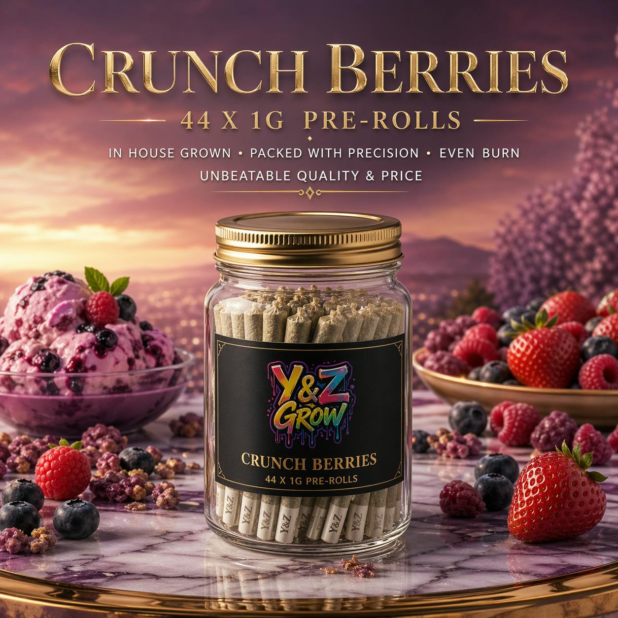 Blueberry is a smooth, fruit-forward classic elevated through the signature standard of Y&Z Grow. Grown entirely in-house, this strain delivers rich berry sweetness, a soft creamy finish, and a flavorful profile that feels both comforting and refined. Every pre-roll is packed with precision to ensure a clean draw, an even burn, and a consistently polished smoking experience from start to finish. With standout flavor, dependable craftsmanship, and unbeatable quality and price, Blueberry is a timeless strain made for those who appreciate premium flower done right.