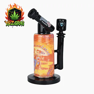 The Grateful Dead Inside Print Water Pipe from Pulsar features the Sunset Dance design depicting a skeletal pair of hippies dancing in the sunset. The rig style water pipe is crafted with a slitted disc percolator and an angled sidecar mouthpiece with The Grateful Dead x Pulsar logo on the neck. The pipe includes a matching 14mm male herb slide with a dichro Steal Your Face design.