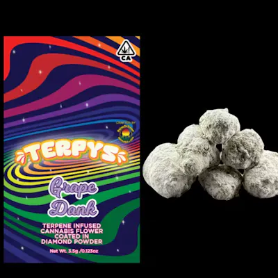 TERPYS flower is terpene infused and coated with premium THCa diamonds, for an elevated smoking experience that’s packed with flavor. Unwind with Grape Dank Indica, crafted for deep relaxation and mellow vibes. Bursting with rich notes of sweet grape, earthy diesel, and a hint of skunky spice, its aroma and flavor wrap your senses like a cozy blanket. Expect a calming body high and tranquil mindset—perfect for easing stress, settling into the couch, or winding down your day in blissful peace. Enjoy Terpys by Crème De Canna!