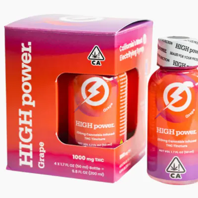 "High Power" is a specific brand of high-potency cannabis tinctures/syrups available in 4-packs, particularly prevalent in California dispensaries. The products typically contain 1000mg of THC per 4-pack, which translates to 250mg per bottle, and are designed for drinking or mixing into beverages.