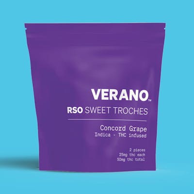 Elevate your taste and experience with Verano RSO Sweet Troches. Infused with full spectrum cannabis oil, these small bites have big flavor and even bigger effects. -- Skip counting sheep, grab Concord Grape Indica RSO for sound sleep and juicy, sweet grape flavors. -- Made with Pectin. Dairy Free, Gluten Free, Nut Free