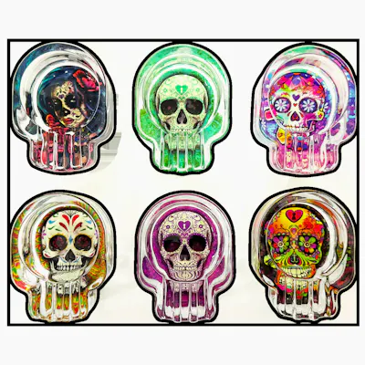 Glass ashtrays with sugar skull designs. Assorted designs to chose from. Great for cigarettes, cigars and more! Includes Glow in the dark styles.