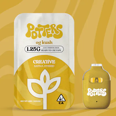 Potters OG Kush All-In-One (AIO) is a live resin disposable vape known for its high-quality, in-house cultivated cannabis and potent, full-bodied experience. Featuring a sativa-hybrid profile, it offers a balanced, euphoric head high paired with a relaxed body sensation, often showcasing notes of earthy pine, citrus, and spicy fuel.