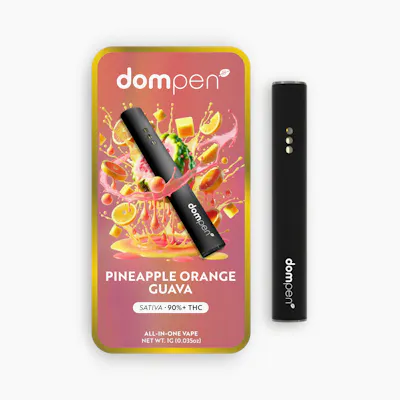 Dompen Pineapple Orange Guava is a sativa-dominant hybrid disposable vape (1g) offering a bright, tropical flavor profile of juicy pineapple, sweet guava, and zesty citrus. Known for its smooth, flavorful vapor and high potency. This cartridge provides an uplifting, energetic, and creative high perfect for daytime, on-the-go use.