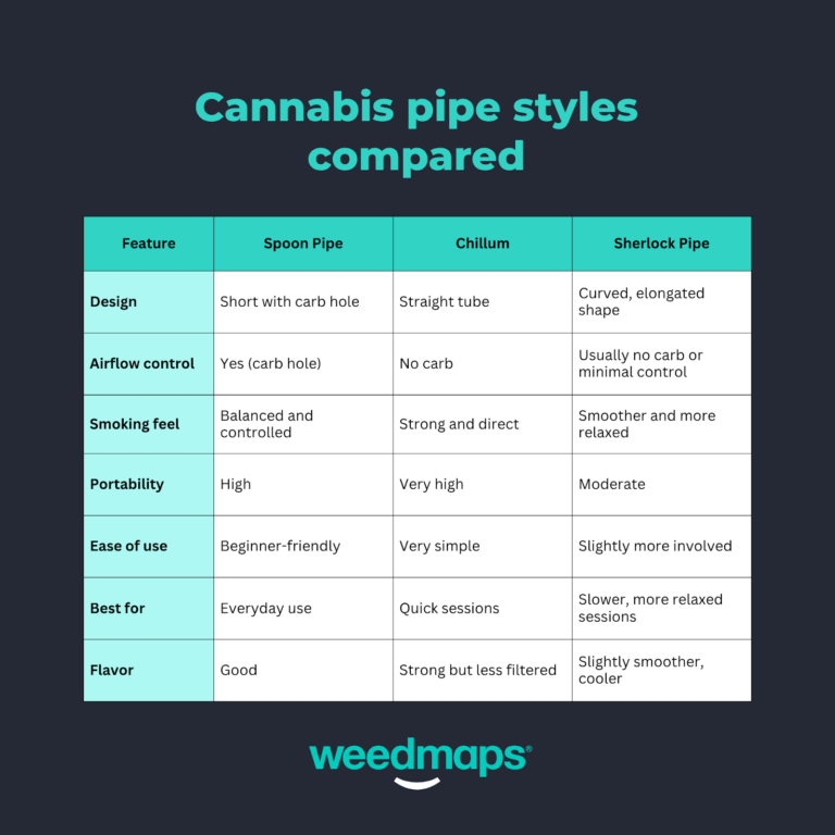 Cannabis pipe styles differ mainly in airflow, portability, and how each hit feels. Different pipe styles fit different moments—quick, on-the-go sessions, controlled solo hits, or slower, more relaxed smoking setups.