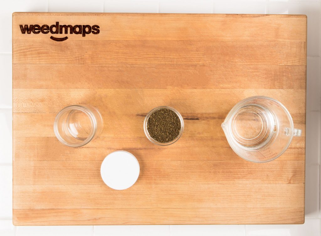 I really like the natural process of making tinctures. I've done a few in the past for things like cold remedies and acne medicine. I use only a half-ounce, or 14.2 grams, of decarboxylated cannabis to keep the dosage low, allowing me to enjoy more of my infused drink without being overwhelmed by the cannabis effects.