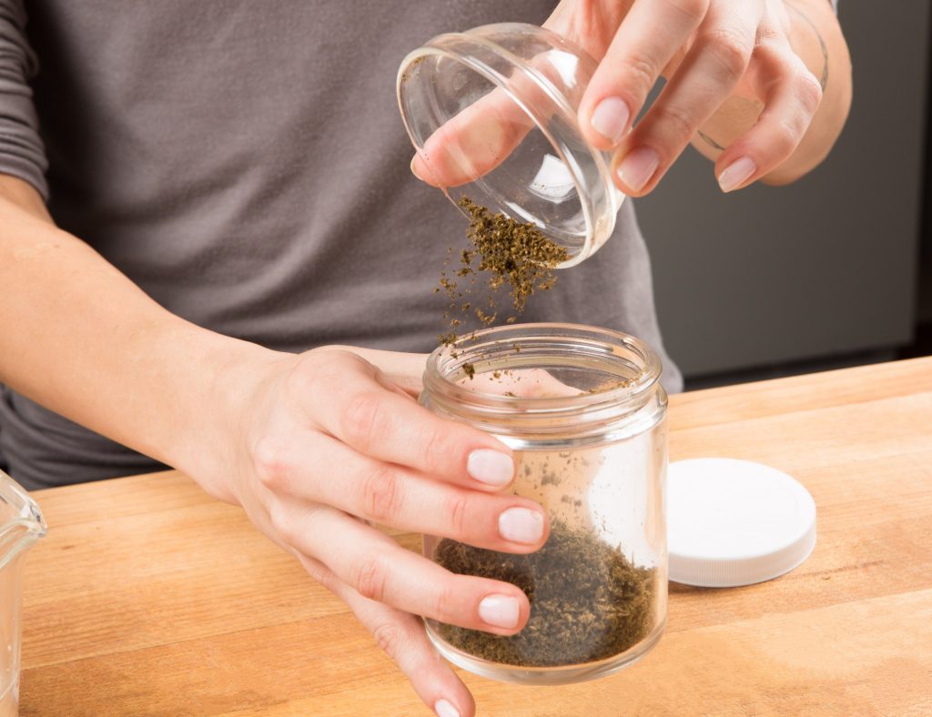 Now that your cannabis is freshly ground and decarbed, fill an empty, dry mason jar with however much of the decarbed cannabis you wish to use and set aside. Make sure the mason jar is completely dry. Next, slowly pour 8 ounces, or 300 milligrams, of vegetable glycerin into the jar.