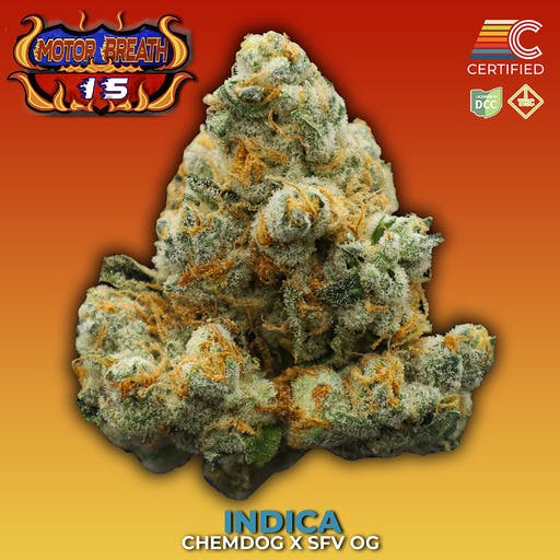 Pisces Genetics combined the D version of legendary strain Chemdawg with the equally renowned San Fernando Valley OG (SFV OG) to create Motorbreath. It’s a rare strain without much info except that it flowers in about 10 weeks and has a chemical, citrus flavor profile, according to online sources.